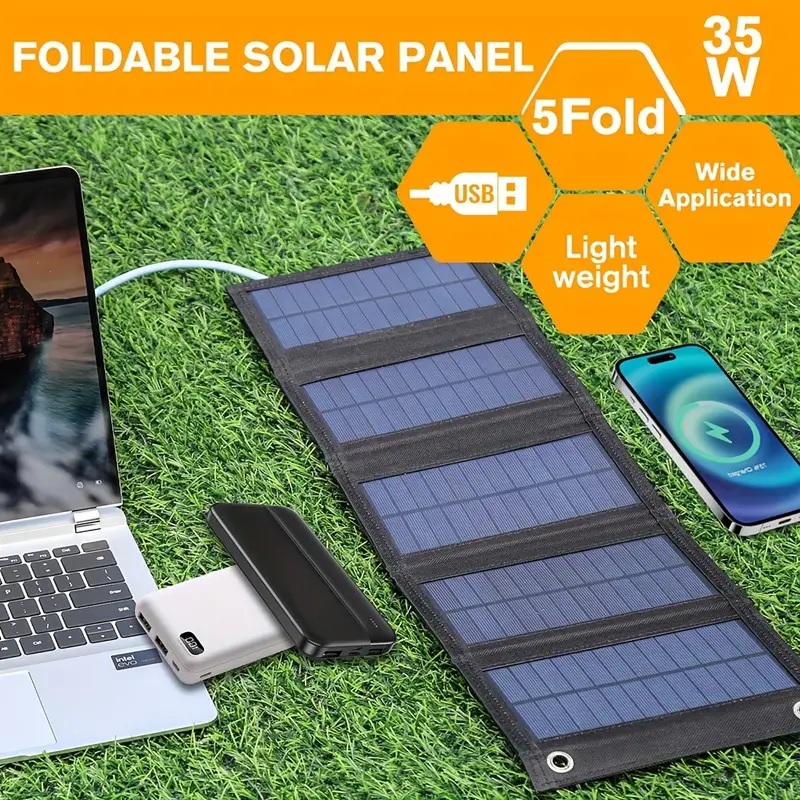 Cargador solar portátil de 35 W, kit de panel solar de viaje USB plegable, cargador con energía solar con voltaje de funcionamiento ≤36 V, potencia de salida de 30-50 W, conector macho a macho, para carga en movimiento