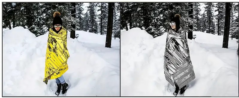 Manta térmica de película de poliéster impermeable de emergencia, equipo de supervivencia al aire libre, solo lavable a mano, todas las estaciones, material PE, detalle de borla, para acampar, senderismo