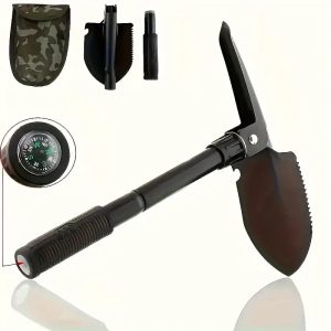 Pala de Supervivencia Plegable Versátil con Sierra, Pico y Abridor de Botellas – Hierro Duradero, Portátil, con brújula
